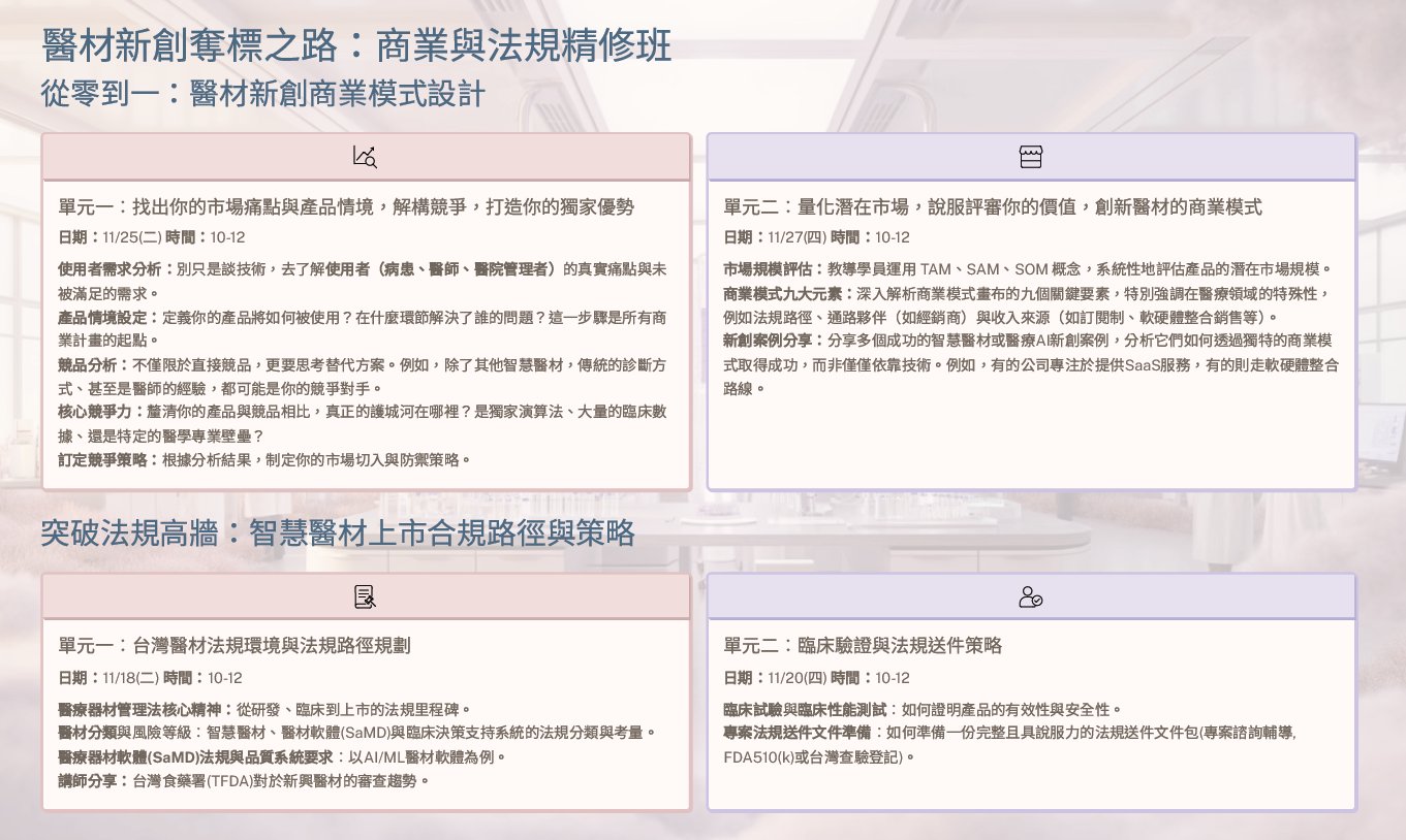 We invite senior industry consultants and expert instructors to guide you through the medical device industry trends, business model transformation, and the practicalities of regulations. Through four intensive sessions, we will help you accelerate your innovative ideas from the "Laboratory" to the "Market"!