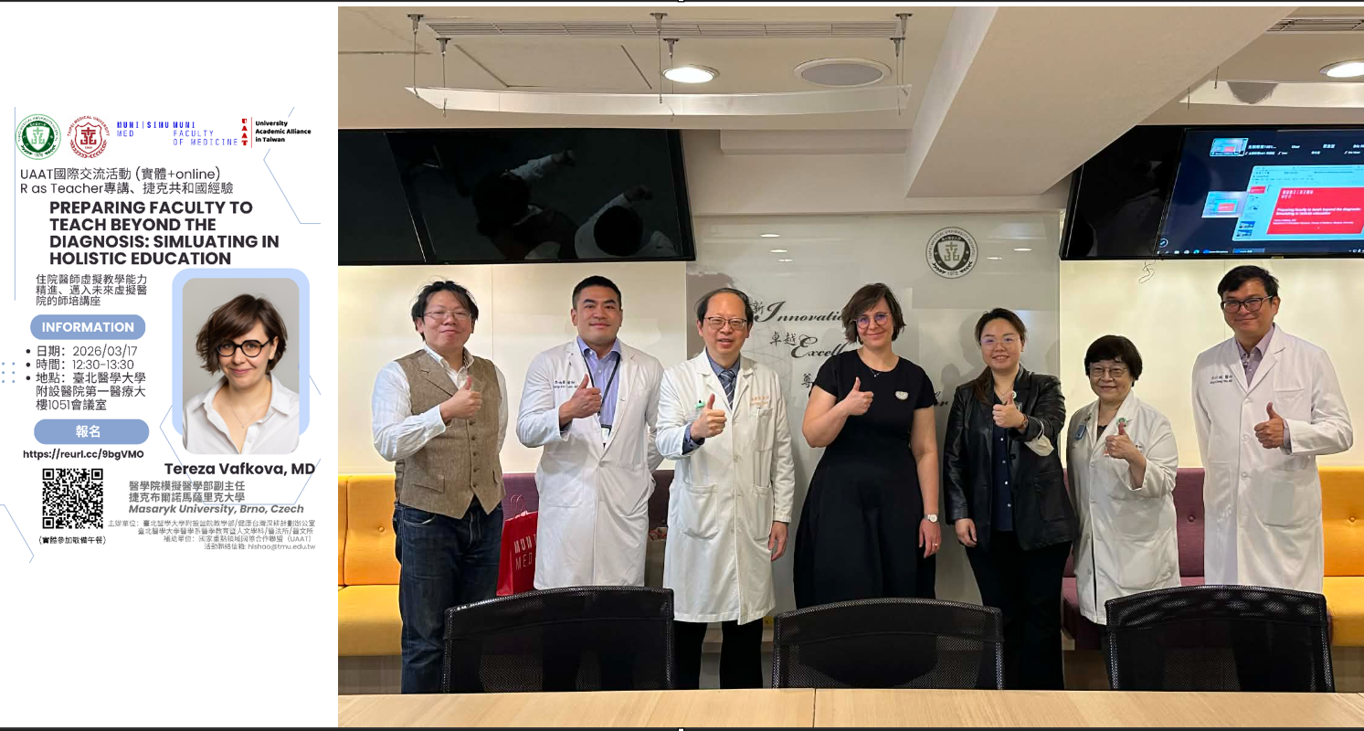 This event is part of the UAAT International Exchange, jointly organized by Hsuan-Lei Shao (GIHBL), Faith Liao (GIMH and the Holistic Care Education Center, Department of Medical Education, TMUH), and the teaching team of TMUH. The lecture invited Dr. Tereza Vafkova, Deputy Head of the Department of Simulation Medicine at Masaryk University, Czech Republic, to deliver a talk at our institution, focusing on the development of “Virtual Hospitals” in Europe and their applications in holistic medical education. A total of 56 physicians, faculty members, and researchers participated in this event, which aims to strengthen international academic collaboration and interdisciplinary exchange.